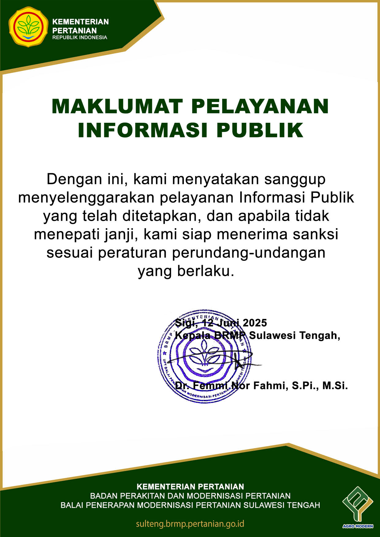 Sebagai badan publik, BRMP Sulawesi Tengah berkomitmen menyelenggarakan pelayanan sesuai standar dan peraturan perundang-undangan. BRMP Sulawesi Tengah memastikan setiap masyarakat dapat memperoleh layanan dengan mudah dan cepat. Komitmen ini tidak hanya menunjukkan dedikasi BRMP Sulawesi Tengah dalam melayani masyarakat, tetapi juga menjadi cerminan dari upaya untuk meningkatkan kualitas layanan publik di sektor pertanian.