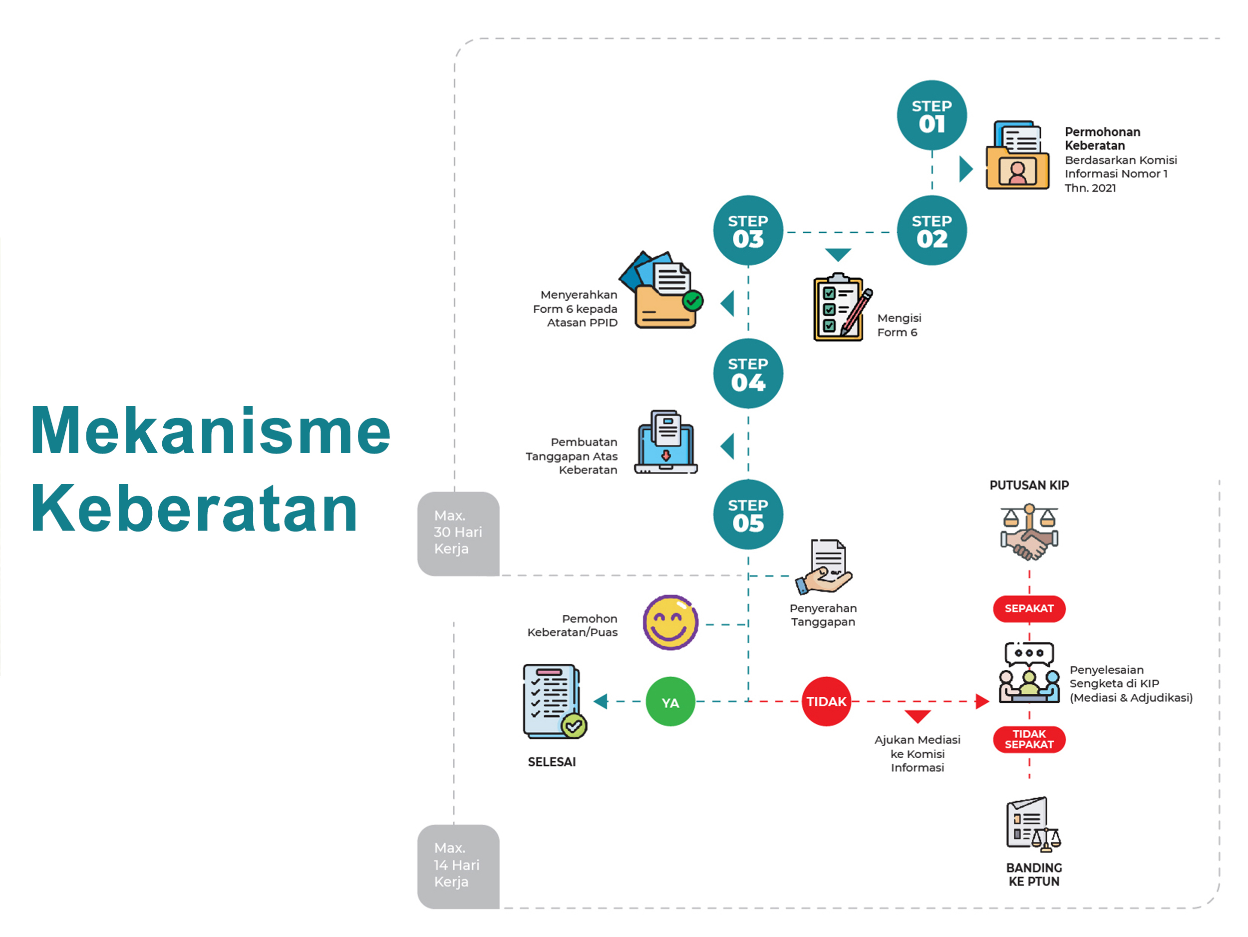 Setiap pemohon informasi publik dapat mengajukan keberatan secara tertulis kepada atasan Pejabat Pengelola Informasi dan Dokumentasi dengan alasan sebagaimana ditetapkan dalam pasal 35 Undang-Undang Nomor 14 Tahun 2008. Keberatan diajukan oleh Pemohon Informasi Publik dalam jangka waktu paling lambat 30 (tiga puluh) hari kerja setelah yang bersangkutan menemukan alasan keberatan.